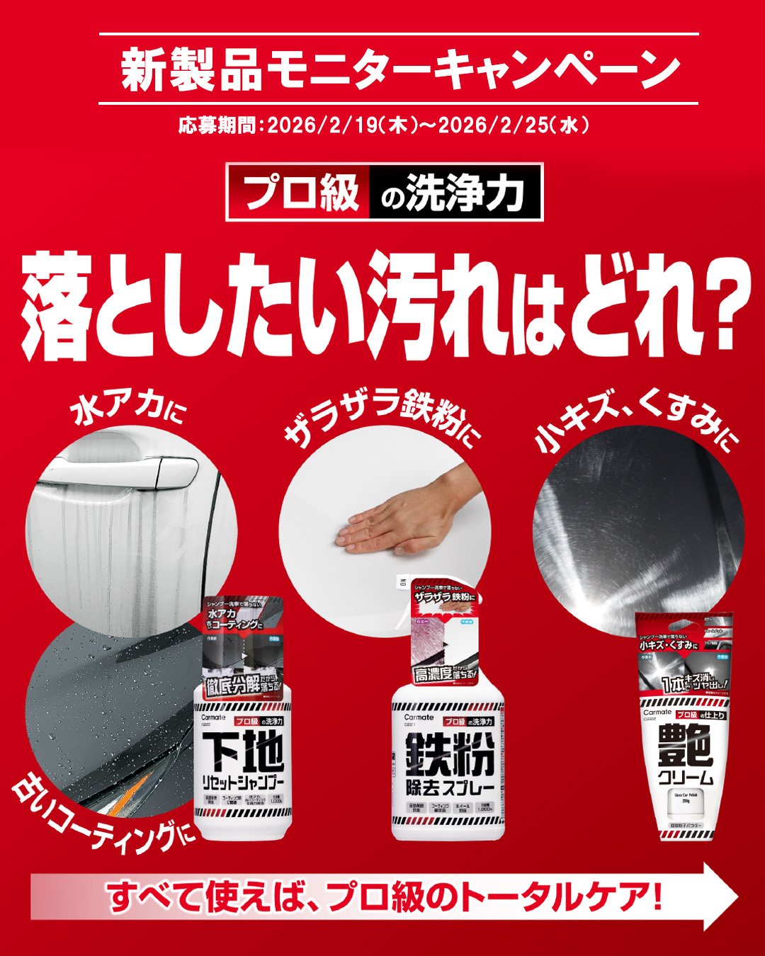 ■下地リセットシャンプー(C220) 本店:https://ps.carmate.co.jp/c/car/c220 楽天店:https://item.rakuten.co.jp/carmate/c220/ Yahoo!ショッピング店:https://store.shopping.yahoo.co.jp/carmate/c220.html Amazon:https://www.amazon.co.jp/dp/B0GLFCWKXB ■鉄粉除去スプレー(C221) 本店:https://ps.carmate.co.jp/c/car/c221 楽天店:https://item.rakuten.co.jp/carmate/c221/ Yahoo!ショッピング店:https://store.shopping.yahoo.co.jp/carmate/c221.html Amazon:https://www.amazon.co.jp/dp/B0GLDXBJPN ■艶クリーム(C222) 本店:https://ps.carmate.co.jp/c/car/c222 楽天店:https://item.rakuten.co.jp/carmate/c222/ Yahoo!ショッピング店:https://store.shopping.yahoo.co.jp/carmate/c222.html Amazon:https://www.amazon.co.jp/dp/B0GLDN8YLV ぜひ、カー用品をお楽しみください 今後もどうぞよろしくお願いします。 |