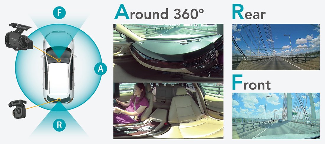 『ダクション 360D』は車両の前後を高画質で記録し、全天周カメラにより車内や側面の記録を実現した360度ドライブレコーダーです。"ARF"とは、A=Around(360度)、R=Rear(後方)、F=Front(前方)の記録が可能で、どの方向の記録も大事に残す本製品のコンセプトを表しています。