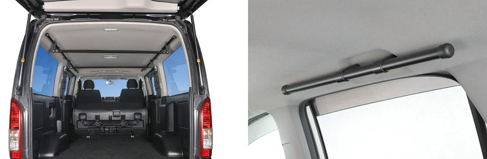 車内キャリアは、ハイエースやNV350キャラバン、軽ワゴンなど様々なクルマの空間を有効に利用するためのシステムです。両サイドのアシストグリップ部にサイドバーを固定し、ハンガーバーを組む事で車内天井にサーフボードやネットを収納するスペースを作ったり小物を吊るすことができます。