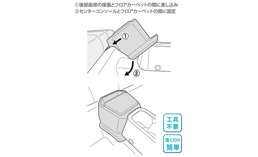 本製品は後部座席の座面とフロアカーペット・センターコンソールとフロアカーペットの間にそれぞれ固定部を挟み込むことで設置します。ドライバーを使用したり、両面テープで固定する必要はないため、簡単に取り付けることができます。後部座席に人が乗車する際、取り外しも簡単です。