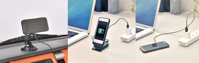 ・充電ベースは利用場所に合わせて「スタンド」「車載用吸盤タイプ」「充電ケーブル(USB)」の3タイプラインナップ