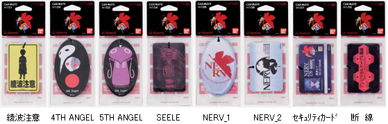 『 ヱヴァンゲリヲン新劇場版』は、前編・中編・後編・完結編の全4部からなり、前編「序」は2007年9月1日に公開され、中編「破」が2009年の初夏に公開される注目のアニメーション映画です。この商品は、その劇中に登場する人物や、象徴するデザインをモチーフにした、紙含浸の芳香剤(エアフレッシュナー)です。株式会社 バンダイが企画・発売し、株式会社 カーメイトが製造・販売。ファンのツボを突く8種類のデザインをラインナップしています(種類は下記参照)。
