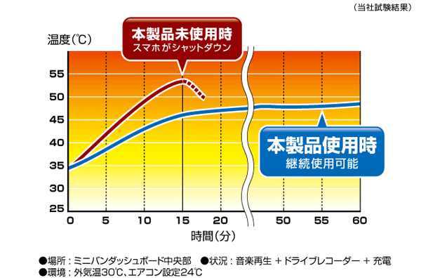 充電しながらアプリを使用すると、スマートフォンの温度が上昇するため、スマートフォンの動作制限が行われる場合があります。以下グラフは、車内で充電しながらアプリを使い続けている時のスマートフォン本体温度変化を試験したもので、製品使用時と未試用時の比較結果です。