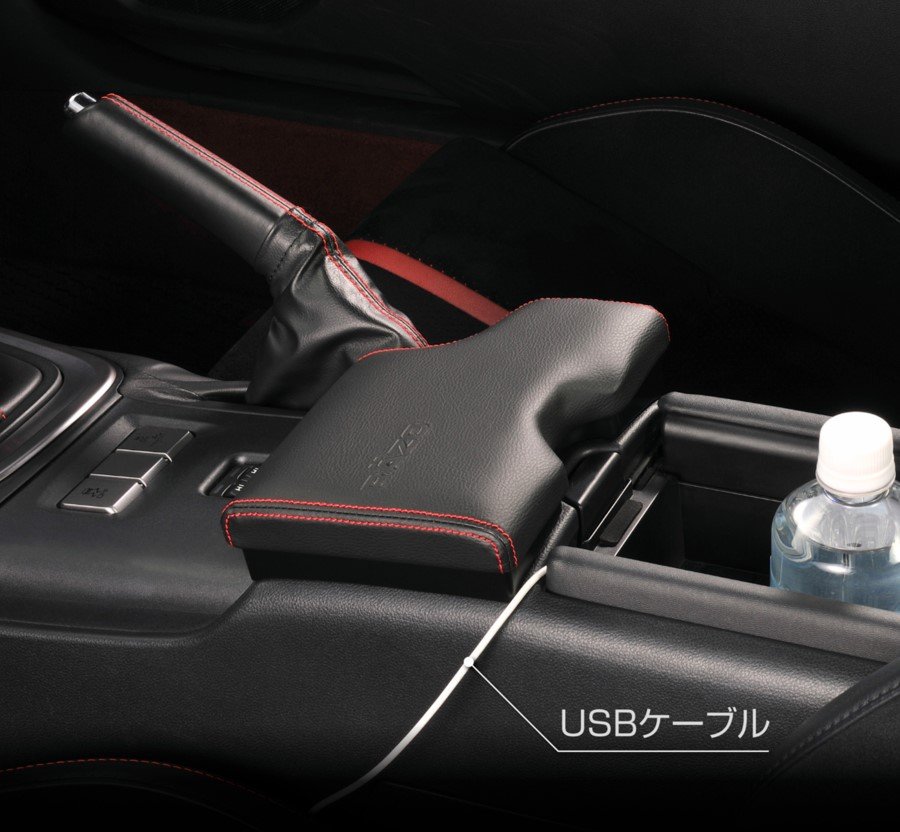 アームレストパッド(NZ838)は、純正コンソールボックスの開閉を妨げず、スイッチ類にも干渉しない形状。コンソールボックス内からUSBケーブルを出して使用することも可能