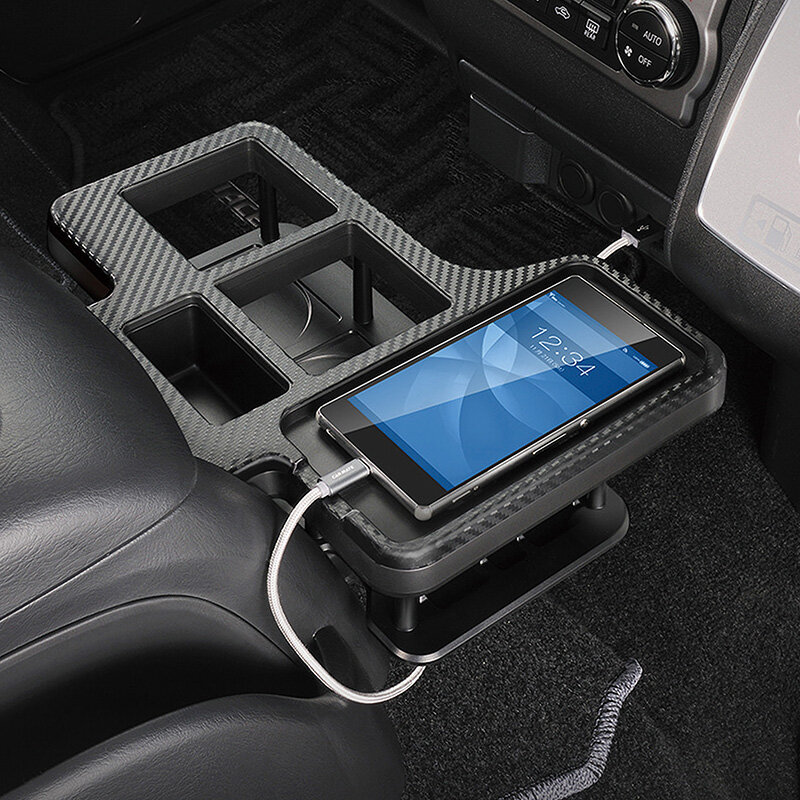 マットブラックを基調とし、天板に質感の高いカーボン調の意匠を採用したハイエース専用設計のドリンクテーブル。 細缶から500mm紙パック飲料が入るドリンクホルダーが2か所、最新のスマートフォンを置くことができるトレイを 備えています。